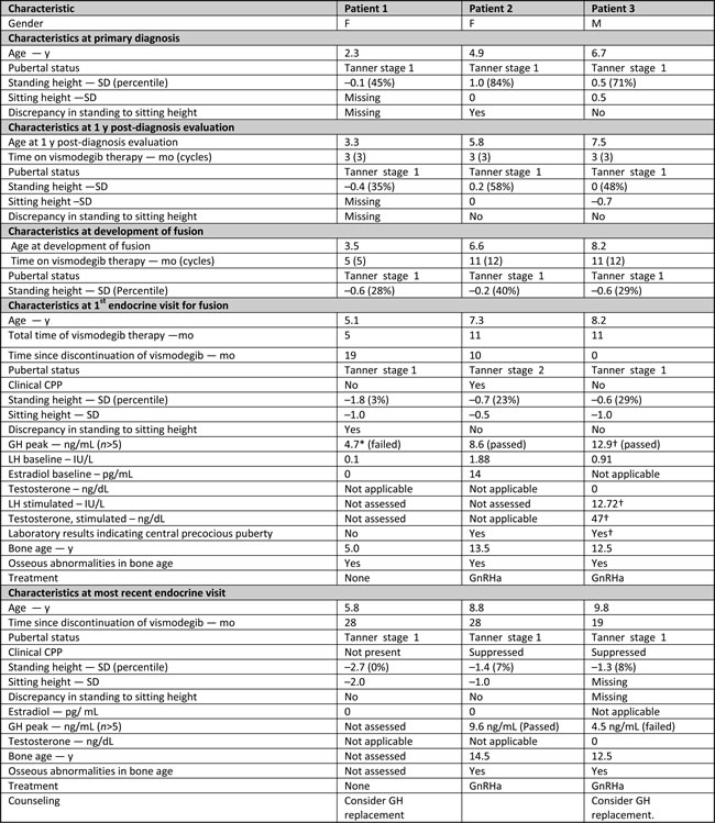 Here, we report 3 patients with SHH-MB treated with vismodegib who developed growth plate fusions. Of them, 2 patients were treated in SJMB12 and 1 patient received single-agent vismodegib off-study after disease relapse.