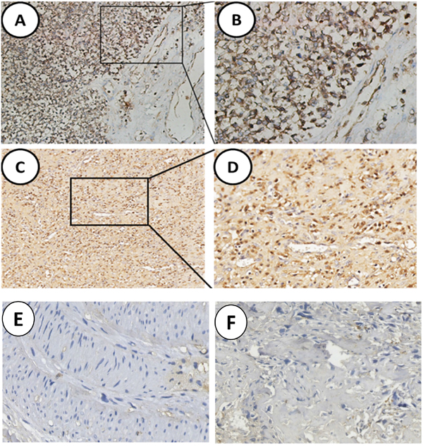 Figure 1: Analysis of SNAT1 expression in human osteosarcoma. (A, C) High level of SNAT1 expression in tumor cells; (B, D) Enlargement of tissues in the frames from A, C, respectively. (E, F) Noncancerous tissues showed negative staining of SNAT1. Original magnification of A, C: 100×; Original magnification of B, D-F: 200×.