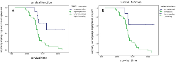 Figure 2: Survival cumulative distribution function of SNAT1 in patients with osteosarcoma. (A) Survival durations were significantly worse in patients with high expression of SNAT1 than in those with low expression of SNAT1. (B) Patients with metastatic tumors had a shorter survival duration than those without metastatic tumors.