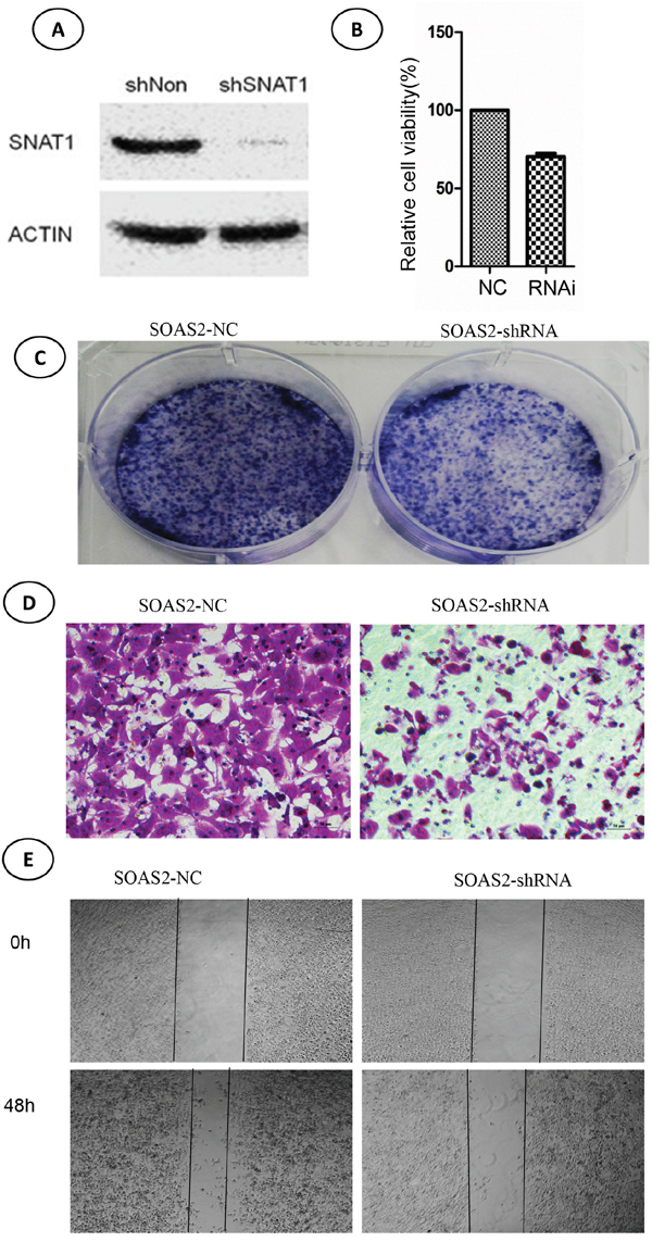 Figure 3: Effects of SNAT-shRNA on cell viability, colony formation, and migration in soas-2 cell lines. (A) Western blotting showed expression of SNAT1 after transfection with SNAT1-shRNA and control for 48 hours. (B) Cell viability was determined by CCK8 assay. (C) Cell viability was determined by colony formation assay. (D, E) Cell migration was determined by transwell assay (D) and wound healing assay (E).