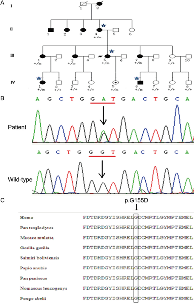 Figure 1: A Chinese ADNFLE pedigre with a mutation in the CABP4 gene. (A) ADNFLE pedigree with c.464G>A mutation in the CABP4 gene. Filled symbols indicate affected individuals and clear symbols unaffected individuals; squares: males; circles: females; arrow represents the proband, and asterisks mark the individuals for whom whole-exome sequencing was performed. Genotypes are indicated for each individual. “+” means wild type; “m” means mutant. (B) The c.464G>A mutation (↓) replaces D (glycine) with G (aspartic acid). (C) Evolutionary conservation of glycine G155. Black arrows indicate the positions of the missense mutations.