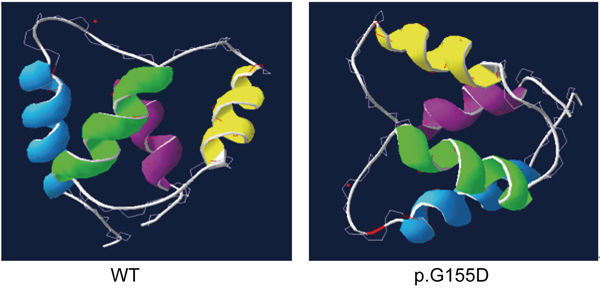 Figure 2: The three dimensional model of the CaBP4 protein containing the four EF-hand motifs (EF1-blue, EF2-green, EF3-yellow, and EF4-cyan) as revealed by the automated homology modeling program ESyPred3D. Left: wild-type (WT) protein; right: p.G155D mutant protein.