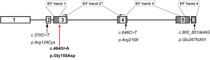 Figure 3: Schematic drawing of the CABP4 gene. Boxes: exons; lines: introns; gray boxes: parts of the gene that encode the EF hands EF1-4, the Ca2+-binding elements in CaBP4; In bold is the c.464G>A mutation and in italic are the previously identified mutations in CABP4. *EF hand 2 is not functional [10].