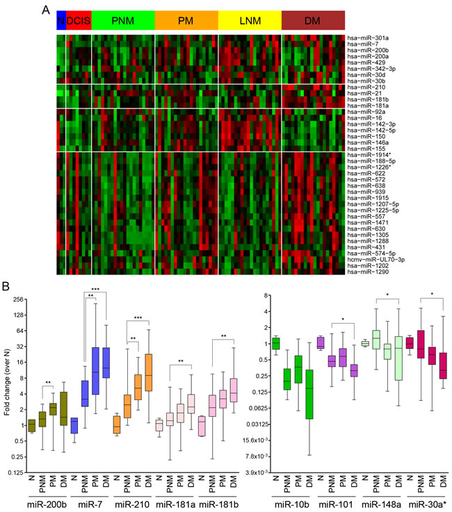 Figure 1: MicroRNAs dysregulated along malignant invasive ductal carcinoma (IDC) progression. A. Microarray analysis of relative expression levels of miRNAs differentially expressed between samples of normal breast epithelium (N), ductal carcinoma in situ (DCIS), primary IDC with no regional lymph node involvement or distant metastasis (PNM), primary IDC with lymph node involvement (PM), matched lymph node metastases (LNM) or distant metastases (DM). The heatmap was generated after probe normalization and selection of differentially expressed miRNAs. B. Quantification by qPCR of levels of selected miRNAs along metastatic progression of IDC. Reference probe-normalized values (n- ΔCt) are shown relative to the median of values for normal breast epithelial tissues (N).