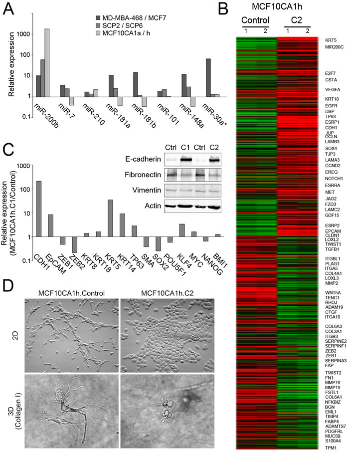 Figure 3: Phenotypic effects of miR-200s expression in MCF10CA1h cells. A. Cell lines with stronger metastatic potential express higher levels of miR-200b. The MDA-MB-468 (highly metastatic) breast cancer cell line was compared to MCF7 cells (poorly metastatic), the MDA-MB-231-derived SCP2 clonal cell line (highly metastatic) to the SCP6 clone (significantly less metastatic) and the MCF10 breast epithelial-derived MCF10CA1a subpopulation (moderately metastatic) to the MCF10CA1h subpopulation (non-metastatic). Shown are ratios (fold-change) for the compared cell lines of reference miR-normalized qPCR values (n- ΔCt) for the indicated miRs. B. MiR-200s induce a mesenchymal-to-epithelial transition (MET) in MCF10CA1h cells, with upregulation of epithelial markers (CDH1, DSP and EPCAM), downregulation of mesenchymal markers (ZEB1, ZEB2, TWIST1, TWIST2, FN1) as well as upregulation of basal (KRT5, KRT14) and luminal (KRT8, KRT18) keratins. Heatmap of relative mRNA levels of epithelial & mesenchymal markers in MCF10CA1h.C2 vs MCF10CA1h.Control cells. Values for genes with significant differential expression between the two cell lines, determined by statistical analysis of microarrays (SAM) were submitted to hierarchical clustering and plotted in a heatmap. Shown on the right are the symbols of selected genes relevant in epithelial and mesenchymal gene programs. C. MET and basal marker induction in MCF10CA1h cells determined by qPCR (cluster 1 miR-200s) and Western blotting (cluster 1 - C1 - and cluster 2 - C2 - miR200s). MiR-200 induce a mesenchymal-to-epithelial transition (MET) in MCF10CA1h cells, with upregulation of CDH1 and EPCAM, downregulation of mesenchymal markers ZEB1, ZEB2, FN1 and ACTA2, as well as upregulation of basal (KRT5, KRT14) and luminal (KRT8, KRT18) keratins and downregulation of SOX2 (but not POU5F1, KLF4, MYC or BMI1). Shown are ratios (fold-change) for MCF10CA1h.C1 vs. MCF10CA1h. Control of RP18S-normalized qPCR values (n- ΔCp) for the indicated mRNAs D. Highly divergent morphologies of control and miR-200 (C2) - expressing MCF10CA1h cells grown as adherent cells on a plastic surface (top) or in 3-dimensional collagen I matrices (bottom).
