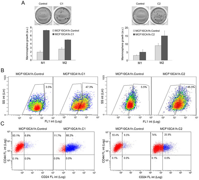 Figure 4: MiR-200s promote the mammosphere growth and ALDH activity of MCFCA1h cells. A. miR-200-Cluster1 (C1; left) and miR-200-Cluster 2 (C2; right) microRNAs potentiate the mammosphere growth of MCF10CA1h cells. Cells (6 x 103/well) were seeded in low-attachment plates and allowed to grow for 7 days (primary mammospheres, M1), disgregated and reseeded for secondary mammosphere formation (M2). Quantification was done after MTT staining and image analysis (n = 3). B. miR-200-C1 (left) and miR-200-C2 (right) strongly induce aldehyde dehydrogenase activity in MCF10CA1h cells. Cells were trypsinized and ALDH activity determined with the Aldefluor assay and flow cytometry. Windows for baseline fluorescence levels were established for cells incubated with the Aldefluor reagent and the ALDH inhibitor diethylaminobenzaldehyde (DEAB). C. miR-200-C1 (left) and miR-200-C2 (right) upregulate cell-surface CD24 in MCF10CA1h cells. Cells in suspension were incubated with Alexa Fluor 647-labeled anti-CD44 and Alexa Fluor-488-labeled anti-CD24 and analyzed by flow cytometry.