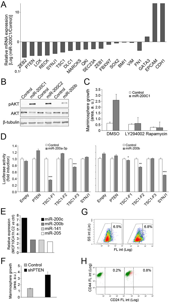 Figure 5: Activation of the PI3K-Akt signaling pathway by expression of miR-200 in MCF10CA1h cells. A. Downregulation of known and predicted miR-200 target RNAs, determined by qPCR. As controls of miR-200 activity, the epithelial markers CDH1 and EPCAM are strongly upregulated, while the mesenchymal marker FN1 is downregulated. B. Induction by miR-200s of steady-state phosphorylation of Akt. Western blotting of total extracts of cells serum-starved for 24 h, probed with anti-pAkt (Ser473), total Akt or β-tubulin. C. Abrogation by LY294002 and rapamycin of miR-200(C1)-induced mammosphere growth of MCF10CA1h cells. D. The mTOR negative regulator TSC1 is a target of miR-200a and miR-200b, and the inositol-1,4,5-trisphosphate 5-phosphatase SYNJ1 is a target of miR-200b. Luciferase assays were run with constructs bearing the indicated 3’-UTR fragments. E. Lentivirally-mediated expression of miR-200-C2 in MCF10CA1h cells induces the expression of endogenous miR-205, as determined by microarray analysis. F. Knockdown of PTEN induces mammosphere growth in MCF10CA1h cells. G. Knockdown of PTEN fails to enhance ALDH activity in MCF10CA1h cells, as assessed by the Aldefluor assay. H. Knockdown of PTEN fails to induce cell surface expression of CD24, determined by flow cytometry.