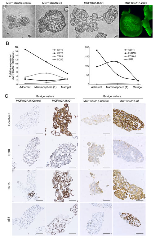 The induction by miR-200s of breast luminal progenitor properties in MCF10CA1h cells prompted us to interrogate whether these cells could acquire further differentiated features under appropriate stimuli. When MCF10CA1h.C1 cells were grown in 5% Matrigel 3-D lattices, they formed highly organized branched tubular structures with multiple terminal hollow alveolar-like structures (Figure 8A), reminiscent of the complex structures formed in vitro from explanted normal mammary epithelial progenitor cells [24]. In contrast, control MCF10CA1h cells only formed amorphous or solid spherical structures (Figure 8A). Further, by co-expressing miR-200b and green fluorescent protein, we demonstrate that these cells contributed equally to both ductal- and alveolar-like structures (Figure 8A).