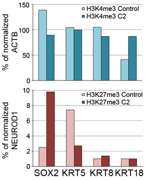 Figure 9: Chromatin immunoprecipitation to determine enrichment of histone markers H3K4me3 or H3K27me3 ChIP on promoter regions of SOX2, KRT5, KRT8 or KRT18 in control or miR-200 (Cluster 2)-expressing MCF10CA1h cells. Shown are normalized input values for the test promoters relative to values for ACTB (H3K4me3 marks, associated with active transcription) or NEUROD1 (H3K27me3 marks, associated with repressed transcription).