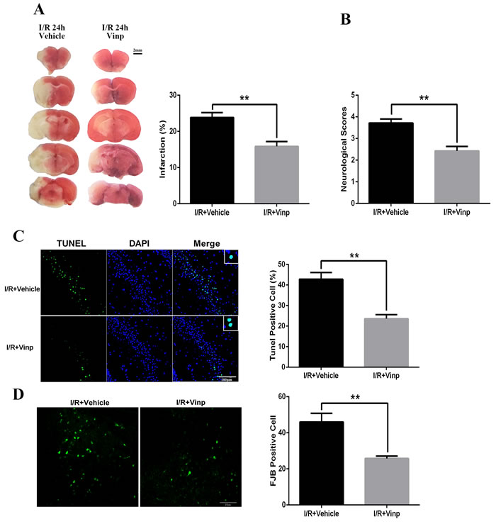 Figure 1: Vinpocetine reduced cerebral ischemia reperfusion injury. After cerebral ischemia/reperfusion injury, Vinpocetine (10 mg/kg) or vehicle was i.p. injected into mice. A. TTC staining and quantification of the infarct volumes (n = 5). B. The vinpocetine treatment significantly decreased the neurological scores (n = 7) and numbers of TUNEL-positive C. and FJB-positive cells D. (n = 5). Data are presented as means±SEM (**p < 0.01).