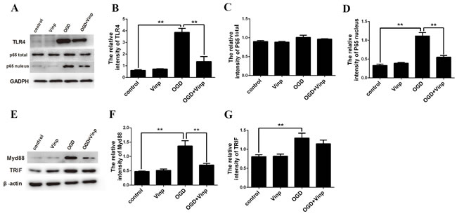 Figure 4: Vinpocetine inhibited the activation of the TLR4/MyD88 /NF-κB pathway in the microglia OGD model. A. Effects of the 50 µmol/L vinpocetine treatment on the levels of the TLR4, total and nuclear NF-κB p65 proteins were examined by Western blotting. The vinpocetine treatment inhibited the increase in TLR4 B. Total NF-κB p65 C. and nuclear NF-κB p65 D. expression are shown. E.-G. The vinpocetine treatment inhibited the increase in MyD88 but not TRIF. Data are presented as means±SEM (**p < 0.01).
