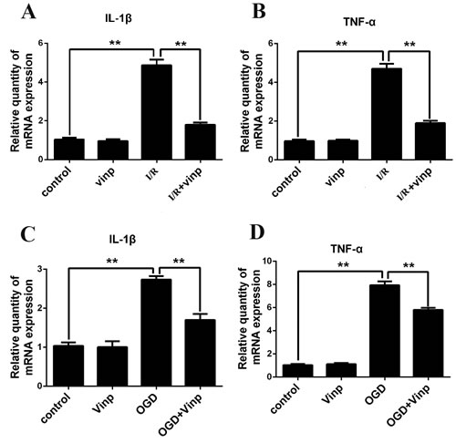 Figure 5: Vinpocetine attenuated inflammatory cytokine release in mice with cerebral ischemia-reperfusion injuries and the cell-based OGD model. Effects of vinpocetine on the secretion of IL-1β A. and TNF-α B. in the mouse cerebral ischemia-reperfusion injury model are shown. Effects of vinpocetine on the secretion of IL-1β C. and TNF-α D. in the microglia OGD model are shown. Data are presented as means±SEM (**p < 0.01).