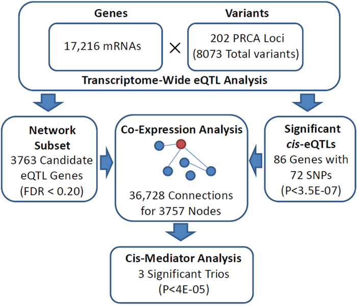 Figure 1: Flowchart indicating analytical stages in identifying significant cis-mediator relationships between PRCA susceptibility loci, proximal cis-genes, and distal trans-genes.