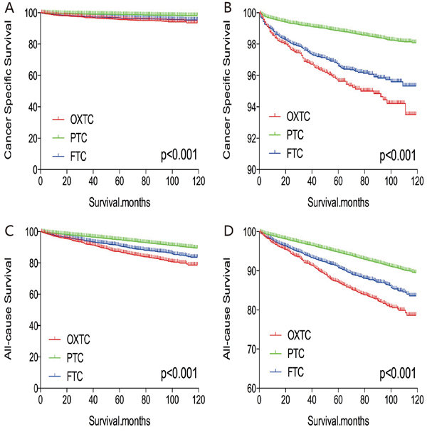 In the present study, patients with OXTC were older (57.69 years old), compared to patients with PTC and FTC. Many studies have indicated that age plays a unique prognostic role in thyroid cancer [18, 20, 21], and the present study confirmed that age was an independent risk factor for both cancer-specific and all-cause mortality. Furthermore, PSM for age, race, and sex confirmed that OXTC was associated with a better prognosis, compared to PTC and FTC. Therefore, an older age at the diagnosis of OXTC may be associated with a relatively poor prognosis.