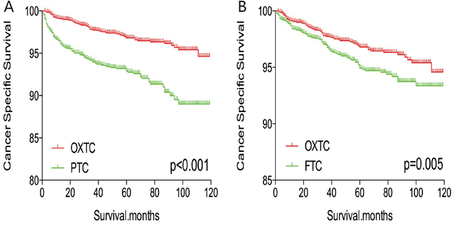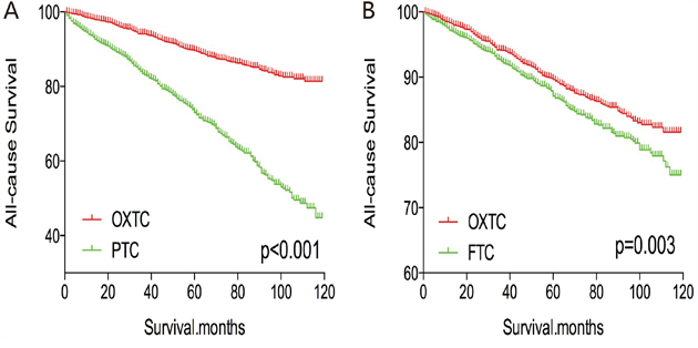 In conclusion, our results indicate that patients who were diagnosed with OXTC had an unexpectedly good prognosis, compared to patients with PTC or FTC. This information may be useful for selecting appropriate treatments for these patients.