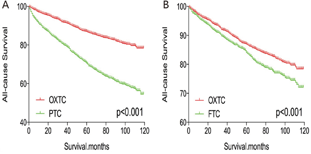 Oxyphilic thyroid tumors (Hurthle cell tumors) include Hurthle cell adenoma, Hurthle cell thyroid carcinoma, and Hurthle cell papillary thyroid carcinoma. The oxyphilic cells exhibit various features, such as a finely granular eosinophilic cytoplasm and an increased number of mitochondria in the thyroid ultrastructure [13]. However, given the rarity of thyroid malignancies, little is known regarding the long-term survival of patients with OXTC, and conflicting results have been reported in the limited number of single-center studies, which had relatively small samples sizes [14–17].