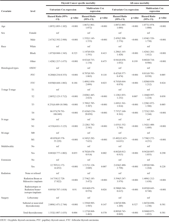 Table 3: Risk factors for survival: outcome of thyroid cancer specific mortality and all-cause mortality