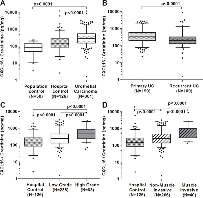 Accordingly, CXCL16 results were quantitatively confirmed in spot urine samples from 434 urological inpatients. Urine samples were collected from these patients prior to cystoscopy and upper urinary tract inspection, and treatment by transurethral resection of cancer-suspicious lesions. Subsequent pathological examination of all tissue samples by two pathologists revealed 308 patients with UC (253 men and 55 women; 200 primary UC and 108 recurrent UC); whereas 126 patients (91 men, 35 women) were cancer-free, but histologically diagnosed with urocystitis. These patients were used as urological hospital controls. In addition, 50 healthy subjects without former UC, (39 men and 11 women) were enrolled from the same residential areas (Table 1). Their urine samples were collected and prepared for analysis using identical Standard Operating Procedures (SOPs) done for all hospital inpatients.