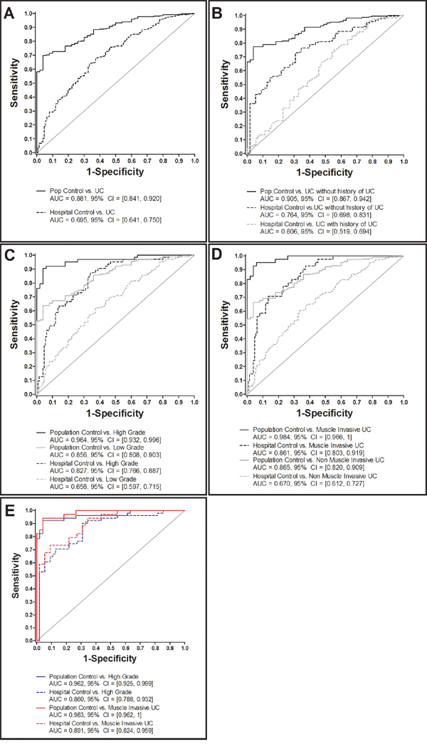 A major strength of our study is the use of two different control groups: urological hospital controls and population-based control subjects. Urological hospital controls frequently suffer from conditions, such as urinary tract infections, which are known to affect protein-based markers, i.e., NMP22 [13]. Therefore, the comparison of marker levels between UC patients with urological hospital controls was an important part of our analysis, rather than using population-based controls only. In addition, the main source population (urological hospital controls and UC patients) and recruitment procedures very closely represented typical clinical and residence urologists’ situations. In such settings, high-risk patients (e.g. with haematuria at primary diagnosis, with abnormal cystoscopy results or under surveillance) are most likely to benefit from the adoption of a non-invasive urine test for diagnosis. Nevertheless, separate studies testing CXCL16 against control patients who reflect the range of different pathologies that are found in daily urologic or gynaecologic practice, such as (micro)haematuria, infection, urolithiasis, and urological and gynaecological cancers (other than UC) would be an important further analysis. Because our results specifically highlight the use of CXCL16 for companion diagnostics with a preference for primary and high grade UC, a highly specific validation in such a collective is of particular importance. The marker may be most relevant for patients with high grade T1 disease, as they are believed to be understated and develop recurrences.