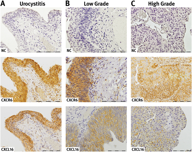 In summary, we present CXCL16 as a promising biomarker candidate for high-grade or muscle invasive UC that is suitable for companion diagnostics in UC patients. Our results on CXCL16 in UC tissue, together with those from previously published data in other solid tumours suggest a critical role for this chemokine in tumour progression, patient prognosis, and as a potentially successful treatment by targeted immunotherapy.