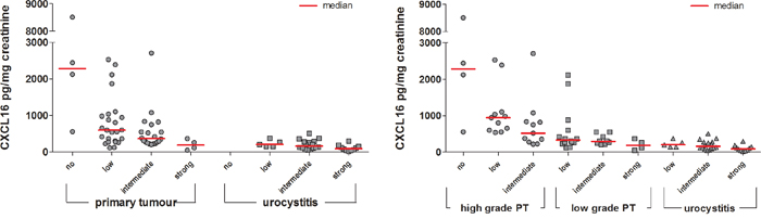 Figure 4: Semi-quantitative analysis of CXCL16 immunoreactivity in primary tumours (high and low grade) and urocystitis tissues in relation to the CXCL16 concentration found in the urine supernatant of these patients. Staining of CXCL16 in patient tissue was categorized as absent, low, intermediate or strong according to method 1 (Table 3). Normalized CXCL16 concentrations in urine supernatant were compared to the immunoreactivity signal found in the matching tissues.