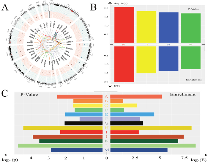 Figure 2: Function analysis for candidate biomarker genes. (A) Circos plot showed all the genes found in previous stage. The location and expression level in Tumor/Normal tissue was indicated. The color of line was depended the GO analysis results listed in Figure 2C. (B) The p-value and enrichment-value was showed. P1: Glutathione metabolism. P2: Drug metabolism - cytochrome P450. P3: Metabolism of xenobiotics by cytochrome P450. P4: Chemical carcinogenesis. (C) The results of GO analysis were showed. A: glutathione transferase activity. B: extracellular region. C. proteinaceous extracellular matrix. D: extracellular space. E: glutathione metabolic process. F: growth factor activity. G: metabolic process. H: nitrobenzene metabolic process. I: extracellular matrix. J: xenobiotic catabolic process. K: glutathione binding. L: cellular detoxification of nitrogen compound. M: glutathione derivative biosynthetic process.
