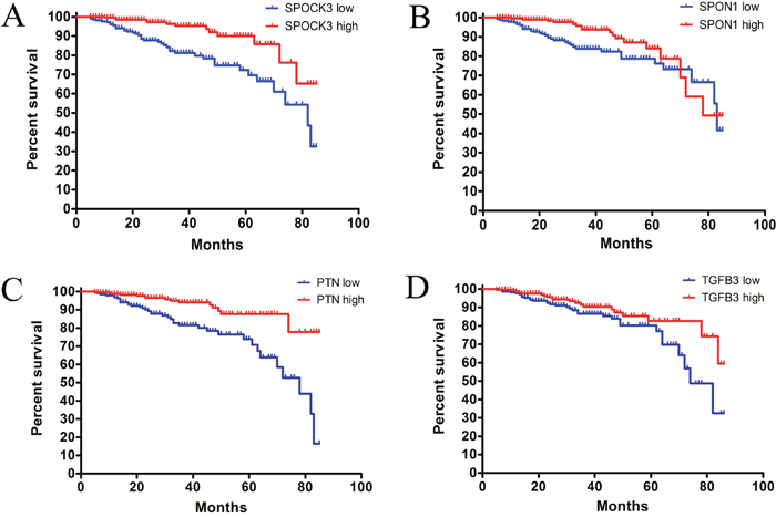 These results indicated that SPOCK3, SPON1, PTN and TGFB3 may be chosen as potential prognostic biomarkers for prostate cancer patients in clinic.