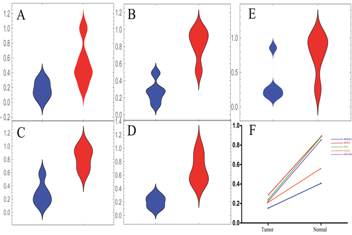 Figure 5: The validation stage for expression level of these five candidate biomarkers. (A-E) The distribution plots of these biomarkers in the validation cohort. The tumor tissue group was marked in blue while normal was red. (A) The distribution status of SPOCK3 in the validation stage. (B) The distribution status of SPON1 in the validation stage. (C) The distribution status of PTN in the validation stage. (D) The distribution status of TGFB3 in the validation stage. (E) The distribution status of MIR1908 in the validation stage. (F) The median line values of distribution plots were calculated and the difference between tumor group and normal group was presented.