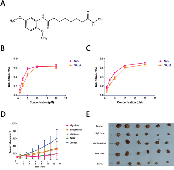 Figure 1: Anti-tumor effects of N25. (A) The chemical structure of N25. (B and C) U87-MG or U251 was exposed to gradually increasing concentrations of N25 or SAHA for 48 hours. Cell viability was detected by using the Cell Counting Kit-8. Cell growth was significantly inhibited after treatment with N25 in U87-MG and U251 cells (P<0.05). (D) U87-MG was subcutaneously injected into nude mice. Mice were treated with one of three doses of N25, SAHA, or 0.9% NaCl. The tumor volume was measured (P<0.05). (E) Xenograft tumor picture.