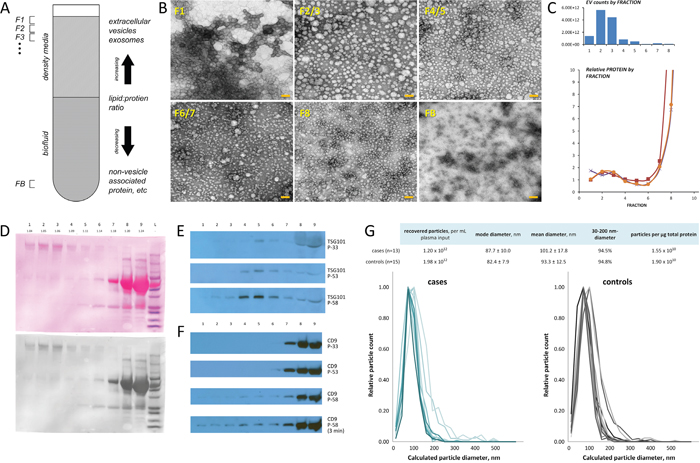 EVs were isolated from plasma by ultracentrifugation flotation though a multi-step density-gradient overlay. Fractions of equal volume were collected from the top of the tube proceeding downward (Figure 1A), yielding vesicle subpopulations with increasing protein:lipid ratio and buoyant densities spanning the range ≤ 1.04-1.32 g/mL. Transmission electron microscopy (TEM) analyses confirmed enrichment of typical exosome-sized (30-200 nm-diameter) vesicles in harvest fractions (Figure 1B, upper and left-most images and Supplementary Figure 2: F1-F8) as well as their absence in the depleted plasma inputs following EV isolation (Figure 1B, lower-right: FB). Nanoparticle-tracking analyses (Particle Metrix, GmbH) were used to quantify the number and size distribution of vesicles in each fraction (Figure 1C, upper), revealing the highest enrichment of exosome-sized particles in fractions 2 and 3 and minimal representation of exosomes in fractions having density ≥ 1.18 (F7-F8).