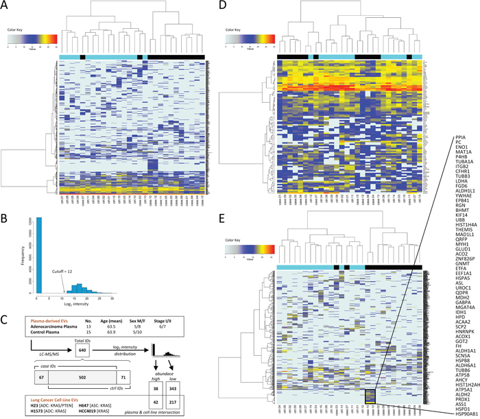In exploring the potential tumor cell source of these differentially expressed proteins, we also characterized the proteome of secreted extracellular vesicles derived from the conditioned media of multiple non-small cell lung adenocarcinoma cell lines. Intersection and bioinformatic consideration of these in vivo and vitro data robust representation of extracellular exosome and membrane-bounded vesicle cellular components; pathways associated with cancer and organismal injuries and abnormalities; and biological processes related to metabolism and biosynthesis, regulation of protein localization and protein quality control.