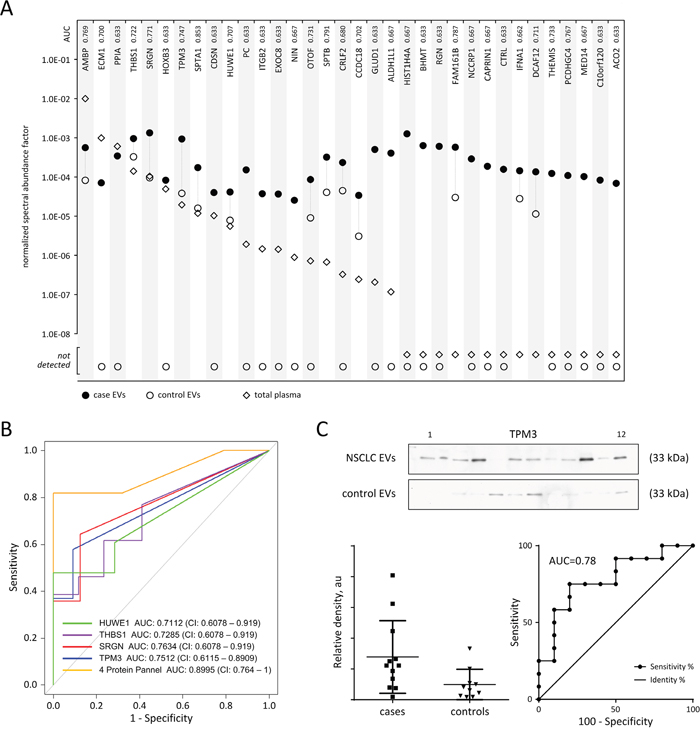 Identification of vesicle-associated proteins in adenocarcinoma case plasmas with known oncogenic roles supports the potential of plasma-derived EVs for liquid biopsy based query of tumor status. SRGN is overexpressed in a number of cancers and elevated cellular SRGN has been correlated with poor survival and recurrence in nasopharyngeal and hepatocellular carcinomas. In primary non-small cell lung cancers, SRGN is overexpressed by both carcinoma and stromal cells, and SRGN has been shown to induce lung cancer cell stemness and promote NSCLC cell migration, invasion and metastatic colonization [27]. Altered expression of tropomyosin isoforms is concomitant with pronounced rearrangements in actin cytoskeleton architecture and has been observed as a patent feature in a number of malignancies. TPM3 specifically has been implicated as an oncogene that modulates focal adhesion stability as well as cell migration, invasion and proliferation [24]. THBS1 is a multifunctional glycoprotein found to be overexpressed in the tumor microenvironment, where it regulates tumor cell adhesion and migration, metastasis and angiogenesis [28]. THBS1 is highly expressed in the stroma of angiogenic non-small-cell lung tumors that also exhibit increased expression of genes for membrane vesicles, integrins, remodeling, angiogenesis and apoptosis [29]. The observed relationship between THBS1 and membrane vesicle aparatus in angiogenic tumor types provides mechanistic insight into the finding of EV-associated THBS1. The E3 ubiquitin (Ub) ligase HUWE1 has been implicated in tumor formation, cell migration and invasion and is significantly overexpressed in a number of epithelial tumors, including lung carcinoma [30]. Alterations to the ubiquitylation machinery, a principal regulator of protein degradation, are found in a number of human cancers. In lung carcinoma cells, aberrant HUWE1-mediated ubiquitylation has been shown to contribute to enhanced cell-cell adhesion disassembly, motility, and invasiveness [20].