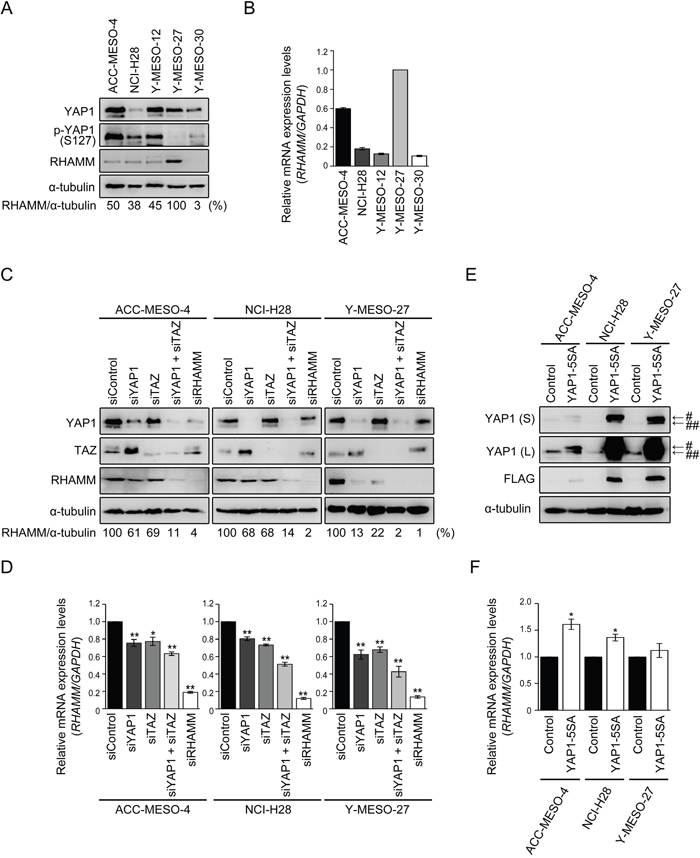 Figure 1: RHAMM expression is regulated by YAP1/TAZ in MPM cells. (A) Protein and (B) mRNA expression profiles of MPM cell lines. Numbers shown in (A) represent values relative to RHAMM/α-tubulin in Y-MESO-27 cells as a reference. (C) Protein and (D) mRNA expression profiles after single knockdown of YAP1, TAZ, and RHAMM or concomitant knockdown of YAP1 and TAZ in MPM cell lines. Numbers shown in (C) represent values relative to RHAMM/α-tubulin in control siRNA-treated cells as a reference. (E) Protein and (F) mRNA expression profiles after forced expression of YAP1-5SA in MPM cell lines. “S” and “L” in (E) indicate “short” and “long” exposure, respectively. # and ## indicate Flag-tagged YAP1 5SA and endogenous YAP1, respectively. Bars in graphs indicate mean ± SEM of three independent experiments. Welch’s t test was used for statistical analysis (*P < 0.05, ** P < 0.01).