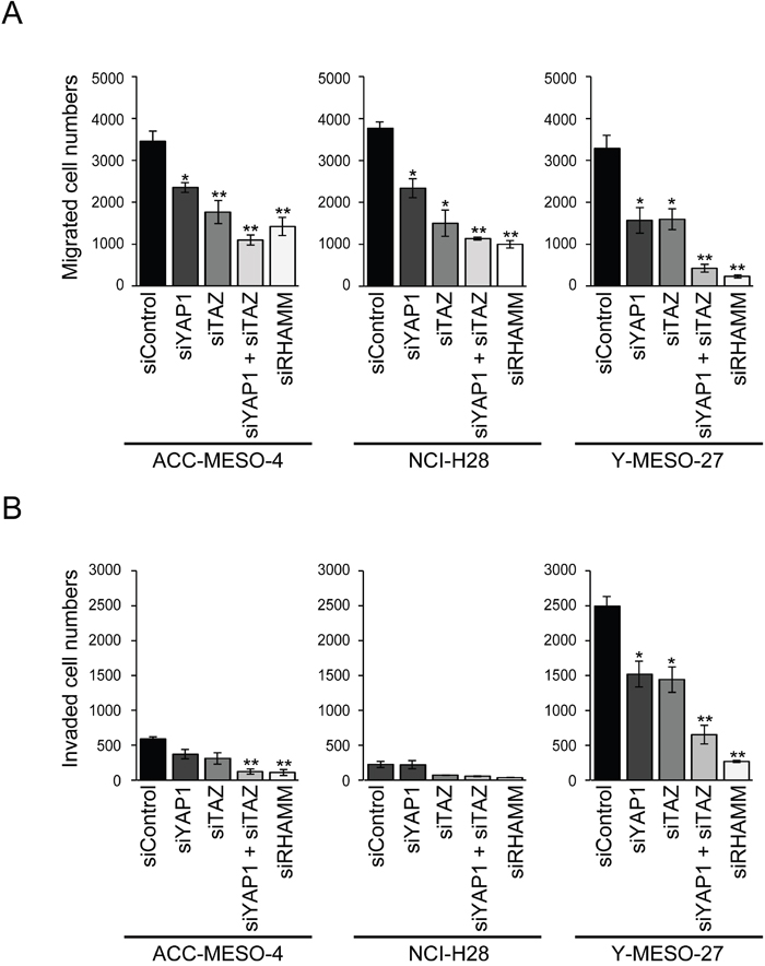 Figure 2: Involvement of the YAP1/TAZ-RHAMM axis in cell migration and invasion in MPM cells. (A) Migration and (B) invasion profiles after single knockdown of YAP1, TAZ, and RHAMM or concomitant knockdown of YAP1 and TAZ in MPM cell lines. Bars in graphs indicate mean ± SEM of three independent experiments. Welch’s t test was used for statistical analysis (*P < 0.05, ** P < 0.01).