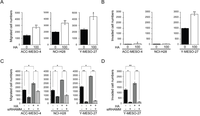 We found that HA significantly stimulated cell migration in all of the cell lines tested (Figure 3A). Cell invasion was stimulated significantly in ACC-MESO-4 and Y-MESO-27 (Figure 3B). To exclude any effect of HA on cell proliferation, we used HA at the concentration (100 μg/ml) that dose not affect cell proliferation significantly (Supplementary Figure 3B)