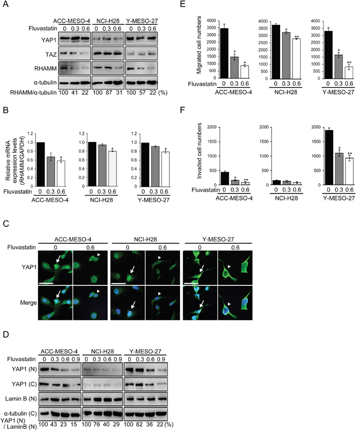 Statins, which are 3-hydroxy-methylglutaryl CoA reductase inhibitors generally used as cholesterol-lowering drugs, are also reported to inhibit the activity of YAP1 in breast cancer [13]. Here, we investigated whether fluvastatin, a member of the statin drug class, was able to decrease cell migration and invasion by inhibiting the YAP1/TAZ-RHAMM axis. First, we assessed the expression profile of RHAMM protein after fluvastatin treatment in the MPM cell lines. The concentration of fluvastatin used in this experiment (maximum 0.6 μM) did not significantly affect cell proliferation (Supplementary Figure 3C). A dose-dependent decrease of RHAMM expression by fluvastatin was observed in all of the cell lines (Figure 4A). Similar trends were observed for mRNA (Figure 4B). Other YAP1-regulated genes such as CTGF and ANKRD1 were also significantly inhibited by fluvastatin treatment (Supplementary Figure 4). Next, we assessed the cellular localization of YAP1 protein using immunofluorescence, as fluvastatin has been shown to suppress YAP1 activity by inhibiting the nuclear localization of YAP1 protein [34]. As expected, fluvastatin treatment caused cytoplasmic sequestration of YAP1 in all of the MPM cell lines (Figure 4C). For confirmation, we also performed a Western blotting analysis using the nuclear/cytoplasmic fraction (Figure 4D) and observed a dose-dependent inhibitory effect of fluvastatin on YAP1 translocation. It is worth noting that fluvastatin at 0.6 μM, which was the maximum concentration we used for the proliferation, migration and invasion assay, inhibited the nuclear translocation of YAP1 by only 55 77 %, 39 60 % and 22 64 % in ACC-MESO-4, NCI-H28 and Y-MESO-27 cells, respectively (Figure 4D). We speculate that this partial incomplete inhibition might have accounted for the less inhibitory effect of fluvastatin on cell proliferation (Supplementary Figure 3C).However, a significant decrease of cell migration was observed in all of the cell lines (Figure 4E), and cell invasion was also reduced, except in NCI-H28 (Figure 4F), at this concentration.