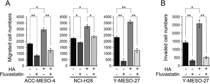 Figure 5: Fluvastatin inhibits HA-augmented cell migration and invasion in MPM cell lines. (A) Migration and (B) invasion profiles after concomitant treatment with HA and fluvastatin. Cells were incubated for 24 h in serum-free medium, treated for 24 h with 0.6 μM fluvastatin with or without 100 μg/ml HA, and then cultured further for 48 h. Bars in graphs indicate mean ± SEM of three independent experiments. Welch’s t test was used for statistical analysis (*P < 0.05, ** P < 0.01).