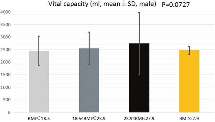 All descriptive data are presented as means and standard deviations or as numbers and percentages. The baseline characteristics for descriptive data were compared using Student’s t test, and categorical variables were analyzed using the X2 test. We calculated odds ratio (OR) and 95% confidence intervals (CI) for the associations between body mass index (BMI) and vital capacity.