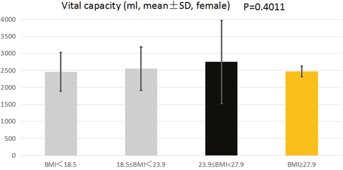 In female college students, there was also no significant difference in vital capacity between the four groups (2455.15±574.4, 2555.06±637.03, 2750.33±1224.05 and 2473.00±159.06, P=0.4011, respectively) (Figure 2). Body composition, such as body fat, fat, muscle, presumption of bone, body moisture, protein and intracellular fluid, may have an effect on lung capacity. Therefore, multivariate regression analysis was performed to adjust confounding factors. Multivariate regression analysis showed that after adjusting for confounding factors, no significant association was observed between BMI and vital capacity (OR=-88.88, 95% CI: -333.59~155.84; OR=20.00, 95% CI: -694.39~734.39; OR=2.86, 95% CI: -1830.58, 1836.3, respectively. BMI<18.5 group served as reference group).