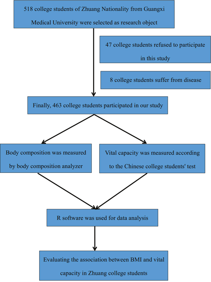 In our study, we aimed to examine the associations between BMI and vital capacity among college students of Zhuang Nationality in China, and provide theoretical reference for Chinese college students' physical health.