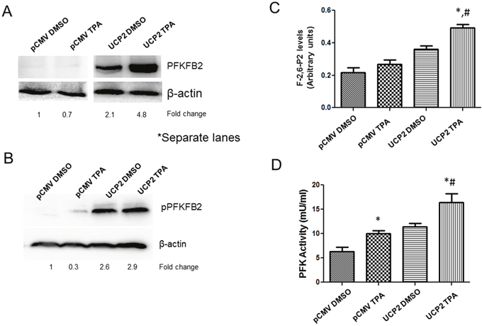 Figure 2: Upregulation of PFKFB2 expression in UCP2 overexpressed cells. (i) Western blot analysis of PFKFB2 (A) and pPFKFB2 (B) expression levels in control pCMV and UCP2 overexpressed cells. β-actin served as loading control. (ii) Fru-2,6-P2 concentration (C) and PFK levels (D) were measured using control pCMV and UCP2 overexpressed cells. n=4 per group, data are presented as the mean ± SD. *, p<0.05 when compared with its own control/DMSO group (n=4 in each group); #, p<0.05 when compared with the control/TPA group.