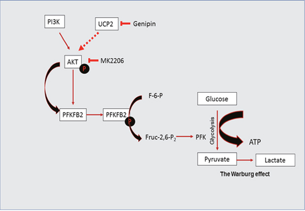 A mounting body of evidence has continued to unequivocally demonstrate that cancer cells have altered metabolism [1]. This feature of metabolic reprogramming of cancer cells is not new and dates back to the early 1920’s. One of the hallmark features of metabolic reprogramming in cancer cells is the enhanced glycolysis leading to lactate production even in the presence of oxygen, as proposed by Otto Warburg [1, 3]. The metabolite transporter activity of UCP2 provides a strong rationale for the notion that highly expressed UCP2 in cancer cells contributes to the Warburg effect [56]. However, how exactly glycolysis is affected by UCP2 is not known.