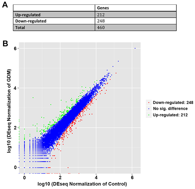 By RNA sequencing, we found that there were 460 differentially expressed genes identified in the umbilical cord blood lymphocytes between normal pregnant women and GDM patients. Of those, 248 genes were down-regulated while 212 genes were up-regulated in the umbilical cord blood lymphocytes from GDM patients compared with those from normal pregnant women (Figure 1A, 1B and Supplementary Table 1).