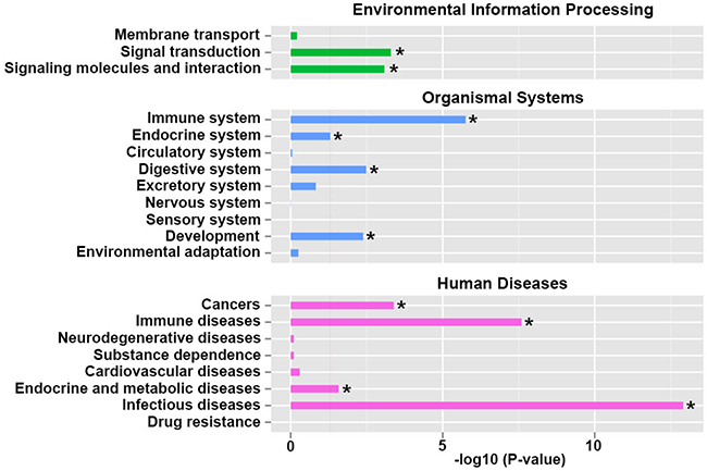 Figure 3: Kyoto Encyclopedia of Genes and Genomes (KEGG) pathway classification enrichment analysis of differentiated expressed genes. Functional annotation and metabolic pathway analysis were grouped in environmental information processing, organismal systems and human diseases. The results are shown as the negative logarithm of significance, which is a statistical score and is a measure of the likelihood of the genes in a given network being found together as a result of chance, as determined by a Fisher’s exact test.