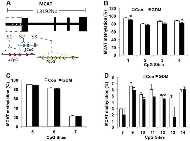 Figure 6: MCAT methylation in umbilical cord blood lymphocytes from normal pregnant women and GDM patients. (A) Schematic diagram of the cytosine phosphate guanine (CpG) sites for MCAT promoter. (B) Methylation levels in CpG sites 1 to 4 in MCAT DMR1 (S1). (C) Methylation levels in CpG sites 5 to 7 in MCAT DMR2 (S2). (D) Methylation levels in CpG sites 8 to 14 in MCAT DMR3 (S3). N=3 in each group. * P<0.05 vs. Con.