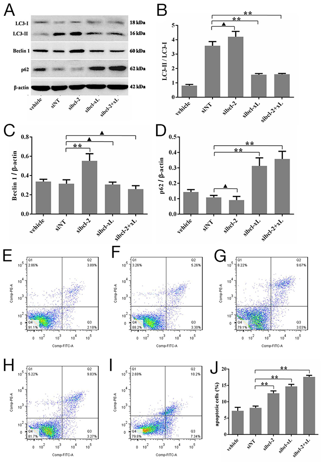 Figure 5: Silencing for Bcl-xL inhibited the autophagic capacity in HSFs, and promoted the apoptosis of HSFs. HSFs, with 70-80% confluent, were transfected by siRNAs and their negative control, cultured in DMEM medium for 48 h, then Western blot analyses. (A, B) The ratio of LC3-II/LC3-L changes in transfected HSFs. (A, C) Autophagy protein Beclin 1 expresses and changes in the Beclin 1/β-actin ratio. (A, D) p62 protein expresses and changes in the p62/β-actin ratio. (E-J) HSFs, with 70-80% confluent, were transfected by siRNAs and their negative control, cultured in DMEM medium for 48 h. Apoptosis was measured by flow cytometric analysis of Annexin V and propidium iodide staining. Blank cells were used as control. Data are representative of three experiments. n = 3, ▲p > 0.05, *p < 0.05, **p < 0.01 compared with the negative control group.