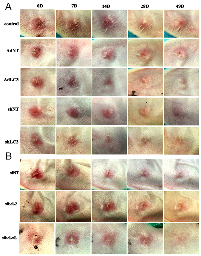 Figure 6: Knockdown of LC3 or Silencing for Bcl-xL improved the appearances of rabbit scar model. The rabbits were anaesthetized and created four full-thickness wounds which were then covered with sterile gauze. On postoperative day 28 and afterwards, scars were randomly placed into eight groups: one PBS group, three control groups (AdNT, shNT and siNT) and four treatment groups (AdLC3, shLC3, sibcl-2 and sibcl-xL). They were applied to the scars two times in a week. After treatment 49 days, (A) the pictures of scar appearance were shown that the scar appearance in shLC3 were smaller and flatter than in AdLC3 and its control. (B) The sibcl-xL group was also smaller and flatter than in sibcl-2 and its control (n = 6).
