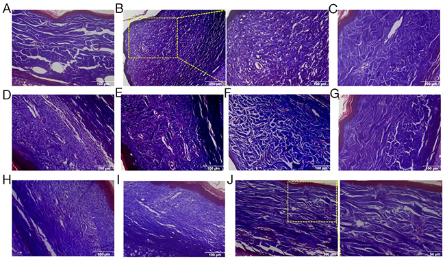 Figure 7: Knockdown of LC3 or Silencing for Bcl-xL reduced the deposition and improved the arrangement of collagen fibers in rabbit scar model. Masson’s trichrome staining findings for collagen fibers. (A) Rabbit ear normal skin with regularly arranged, small collagen fibers. (B) Rabbit ear scar model tissue with thicker, denser and disorganized collage fibers. (C-F, H, I) In PBS, AdNT, AdLC3, shNT, siNT and sibcl-2 groups, the amount of collagen fibers is far more than that in the normal group, and collage fibers are thicker, denser and disorganized. (G, J) After treatment with shLC3 and sibcl-xL for 49 days, the collagen fibers were arranged more regularly and sparser than those in the model, PBS and corresponding control groups. n = 6 scars in each group. Scale bars, a, c-i, 100 μm; b, 250 μm, 100 μm; j, 50 μm.
