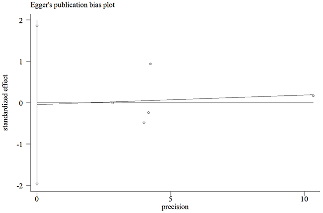Figure 6: Egger’s publication bias plot for the rs3740199 polymorphism (CC+CG vs. GG).