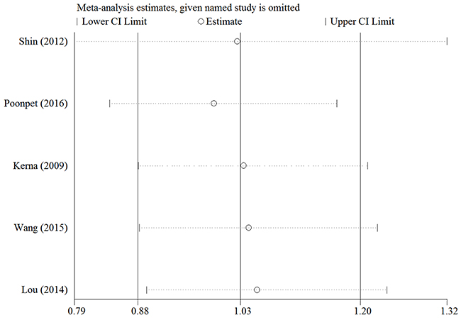 Egger’s and Begg’s tests were performed to assess for publication bias, and funnel plot symmetry was examined for the rs3740199 polymorphism (Because of insufficient degrees of freedom, the other three polymorphisms were not included and analyzed in this section). No proof of publication bias was obtained. For example, in the additive model analysis (CC+CG versus GG), we obtained values of z = 0.73 and P = 0.462 for Begg’s test, and t = -0.08 and P = 0.944 for Egger’s test (Figures 5 and 6, Table 4). Sensitivity analysis was performed to assess the influence of each individual study on the pooled OR by sequential removal of individual studies. The corresponding overall OR was not significantly altered with inclusion or exclusion of each study for the rs3740199 polymorphism (Figure 7).